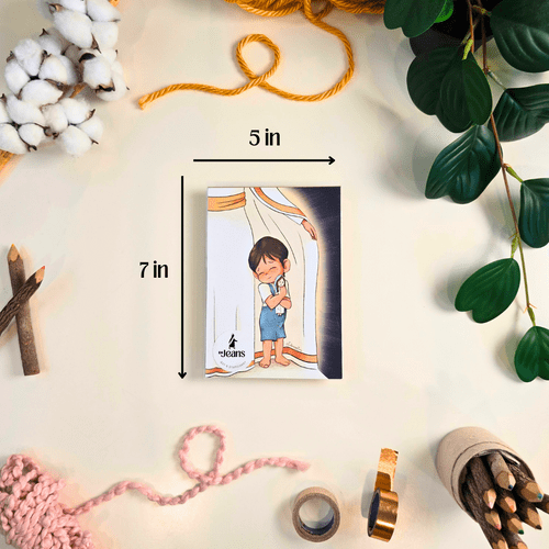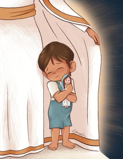 Esta conmovedora impresión muestra la escena de un niño pequeño abrazando una figura de la Virgen María mientras se refugia bajo el manto protector de la Virgen, transmitiendo un profundo sentimiento de amor, protección y confianza. Ideal para enmarcar y decorar espacios con un mensaje de fe y devoción.