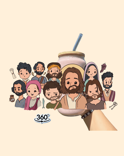 Vaso de cristal con diseño DTF inspirado en Jesús y sus discípulos. Incluye tapa de bambú y sorbeto de cristal. Ideal para disfrutar tus bebidas con fe y estilo.